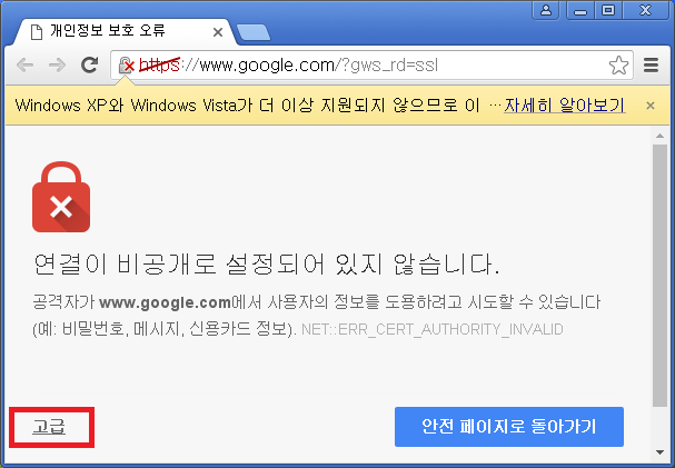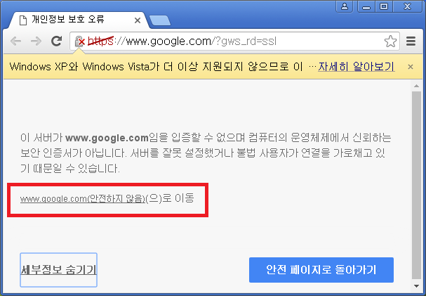 당황할 필요 없이 고급 버튼을 눌러서 'www.google.com(안전하지 않음)(으)로 이동'을 클릭하면