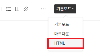 3. 글쓰기 에디터 상단의 '기본 모드'를 클릭하여 'HTML' 모드로 변경한다.