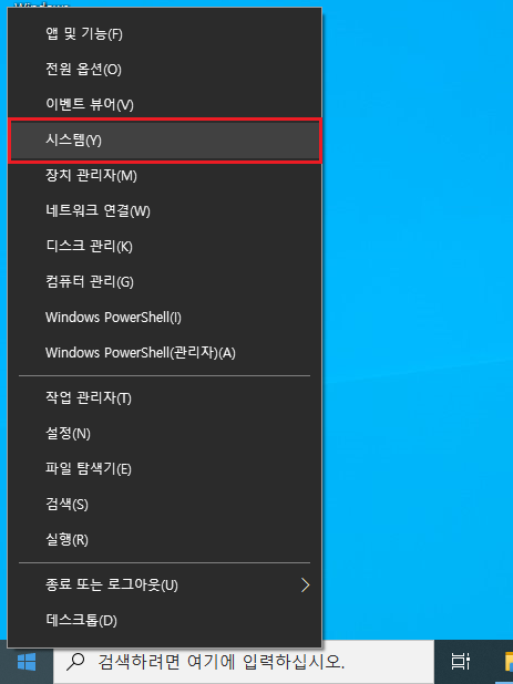1. [시작] 버튼에 마우스 오른쪽 클릭을 하고, 이어서 [시스템]을 클릭해서 정보 창을 띄운다.