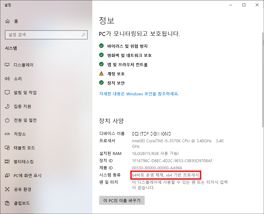 2. [시스템] 창의 항목 중 시스템 종류라고 적혀있는 것이 운영체제의 비트 수를 나타낸 것이다.
