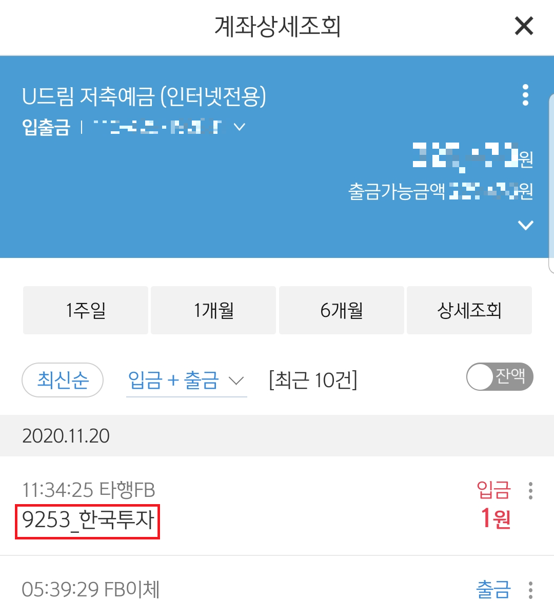 입출금 내역을 살펴보면 네 자리 인증번호(9253)가 보이는데 이걸 입력하고 넘어간다.