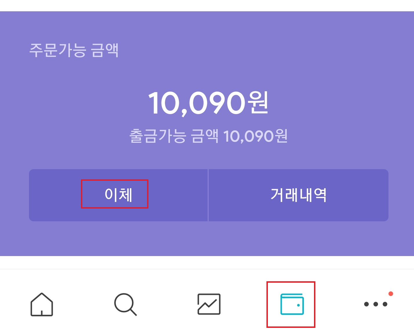 계좌번호는 아래 지갑 모양의 버튼을 누르면 확인이 가능하다.