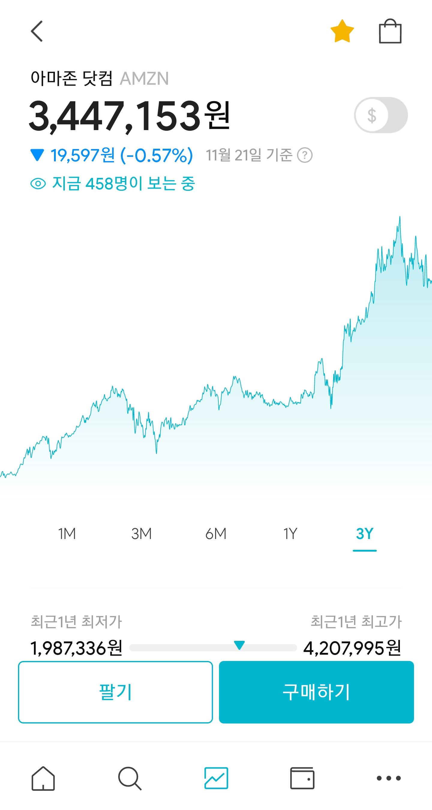 이걸 원화로 환산하면 약 346만원 정도가 되는데, 나 같은 소액 투자자 입장에서 아마존 1주를 매수하기엔 사이즈가 매우 크다.