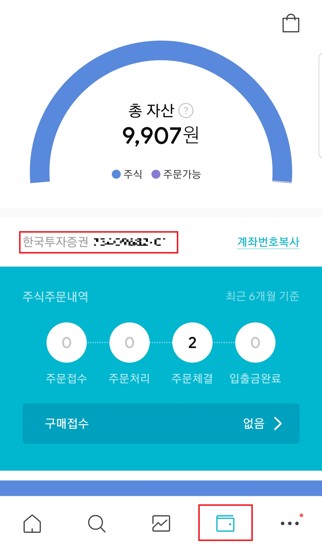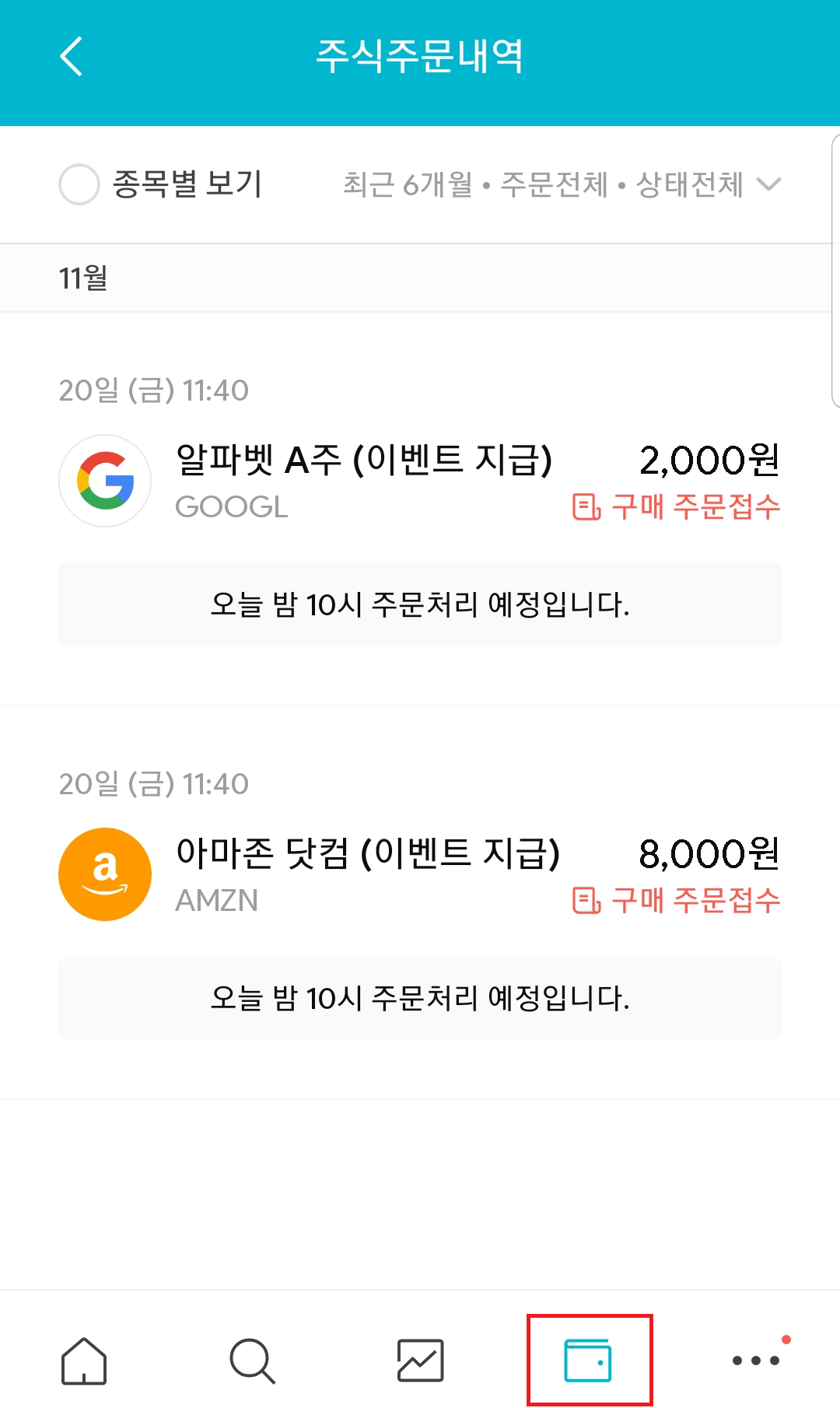 아래쪽 지갑 모양의 버튼을 누르면 주식주문내역에서 주문 현황을 볼 수 있다.