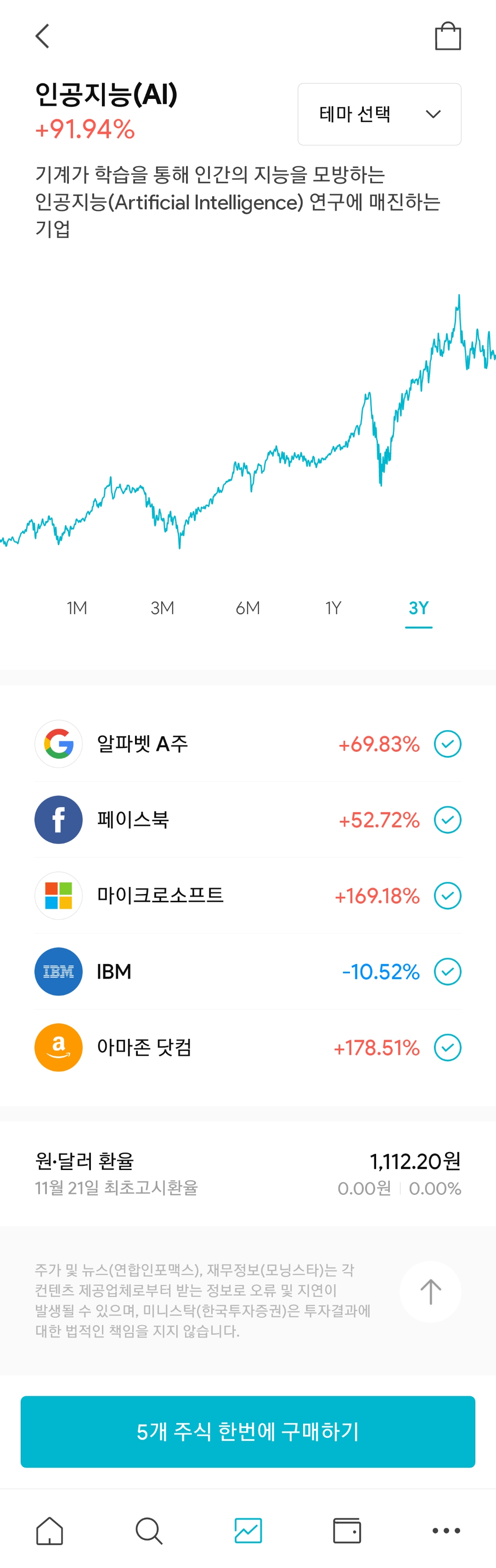 인공지능(AI) 테마를 선택해보니 이런 식으로 테마별 간단한 설명과 관련 종목이 소개된다.