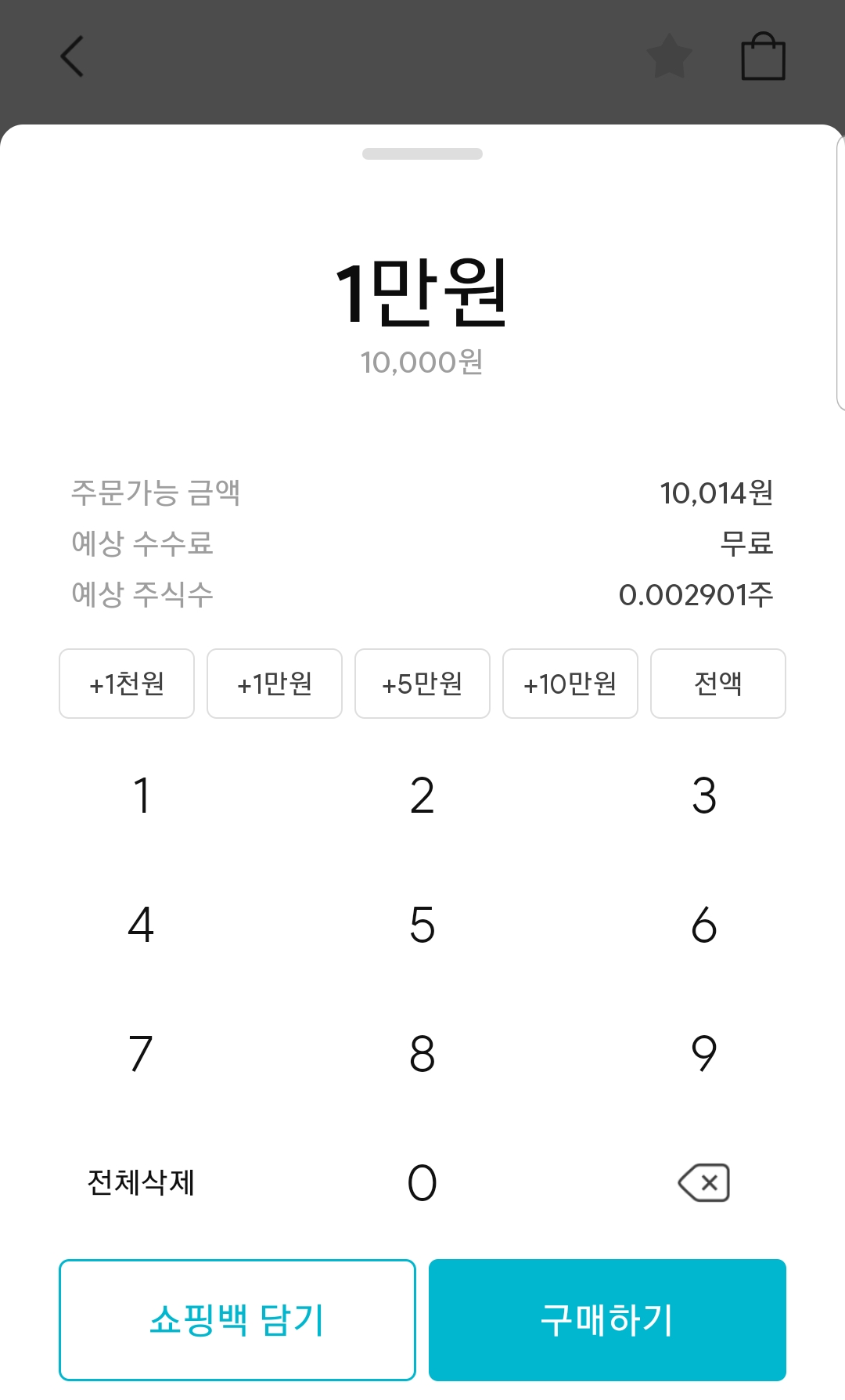 구매하기 버튼을 누르면 이렇게 원화(\) 단위로 매수할 금액을 입력할 수 있고,