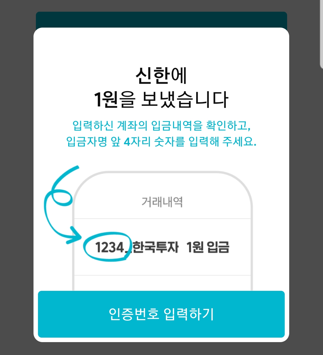 이후 1원 보내기를 클릭하면 입력한 내 계좌로 1원이 입금된다.