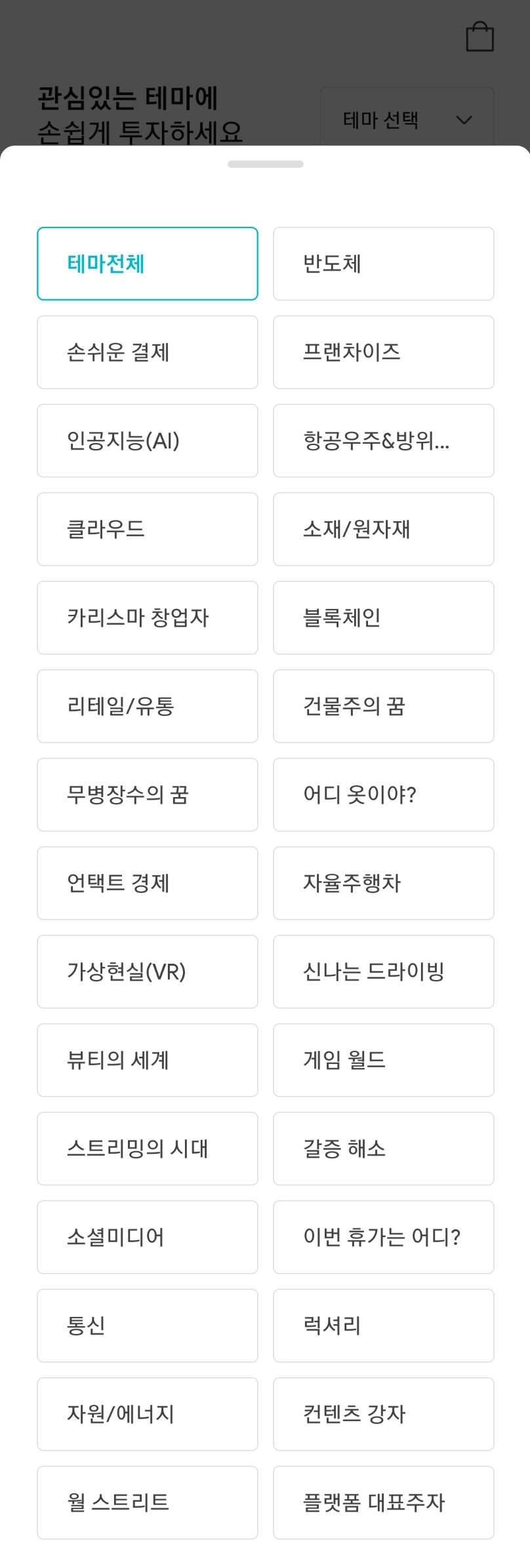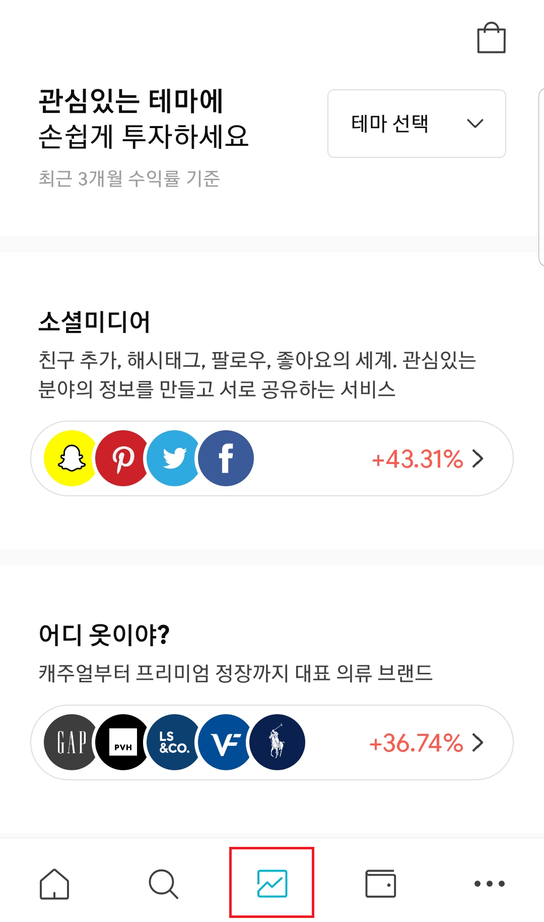 아래 차트 모양의 버튼을 누르면 테마별 종목을 소개하는 페이지가 나온다.