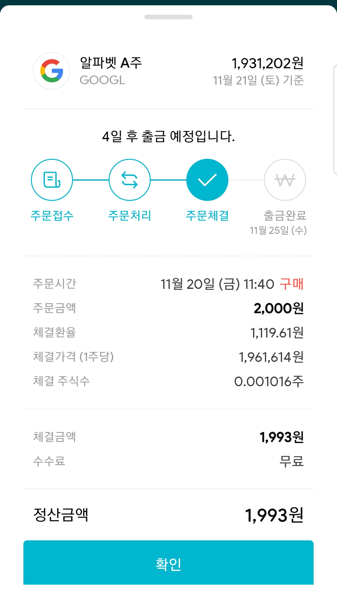 다음날 체결이 완료되면 이런 식으로 체결 환율,체결 가격(1주당), 체결 주식수를 보여준다.