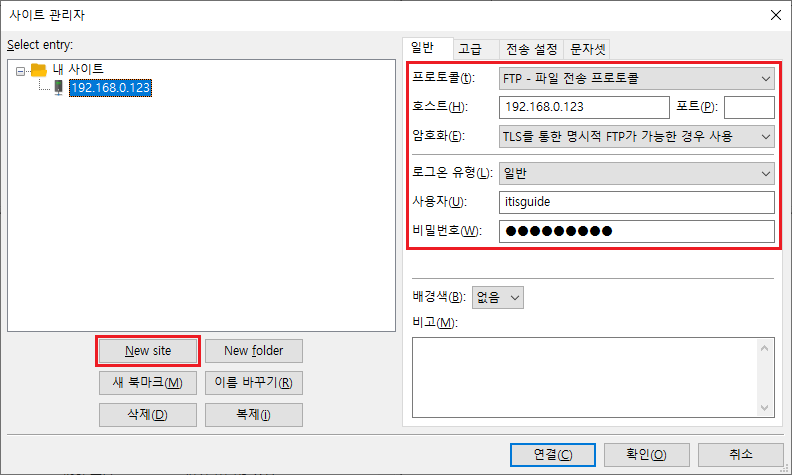2. 사이트 관리자에서 'New Site'를 클릭하여 사이트 접속 정보를 입력한다.