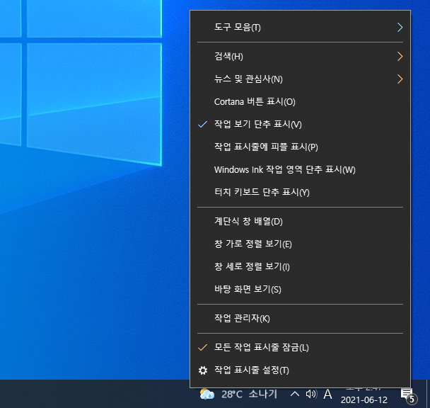 1. 작업 표시줄에서 아무 위치에나 마우스 오른쪽 버튼을 클릭해서 컨텍스트 메뉴를 띄운다.