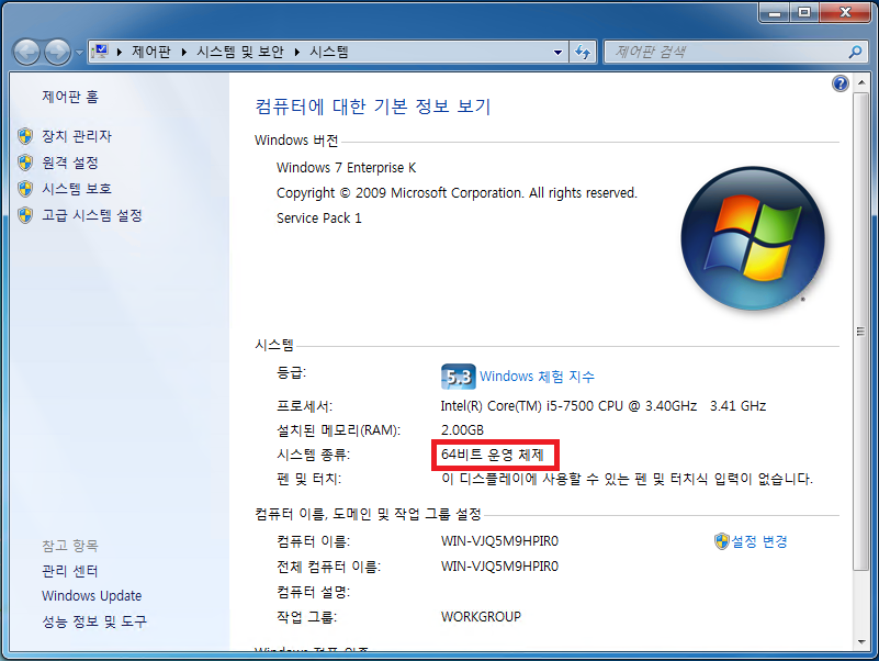 다른 윈도우 OS에서도 동일하게 '시스템 속성' 창에서 비트 수 확인이 가능하다.